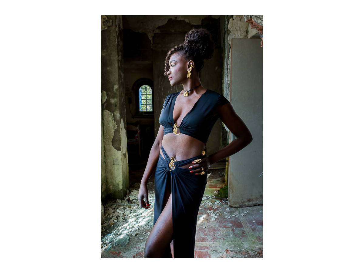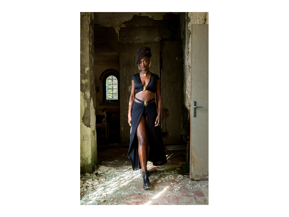Jupe longue, évasée et fendue noire, sublimée d'un élégant bijou, doré à l'or fin 24 carats, aux formes telluriques et dans un esprit couture. Il est habillé de petites pierres de lapis lazuli, d'aigue-marine et de perle.