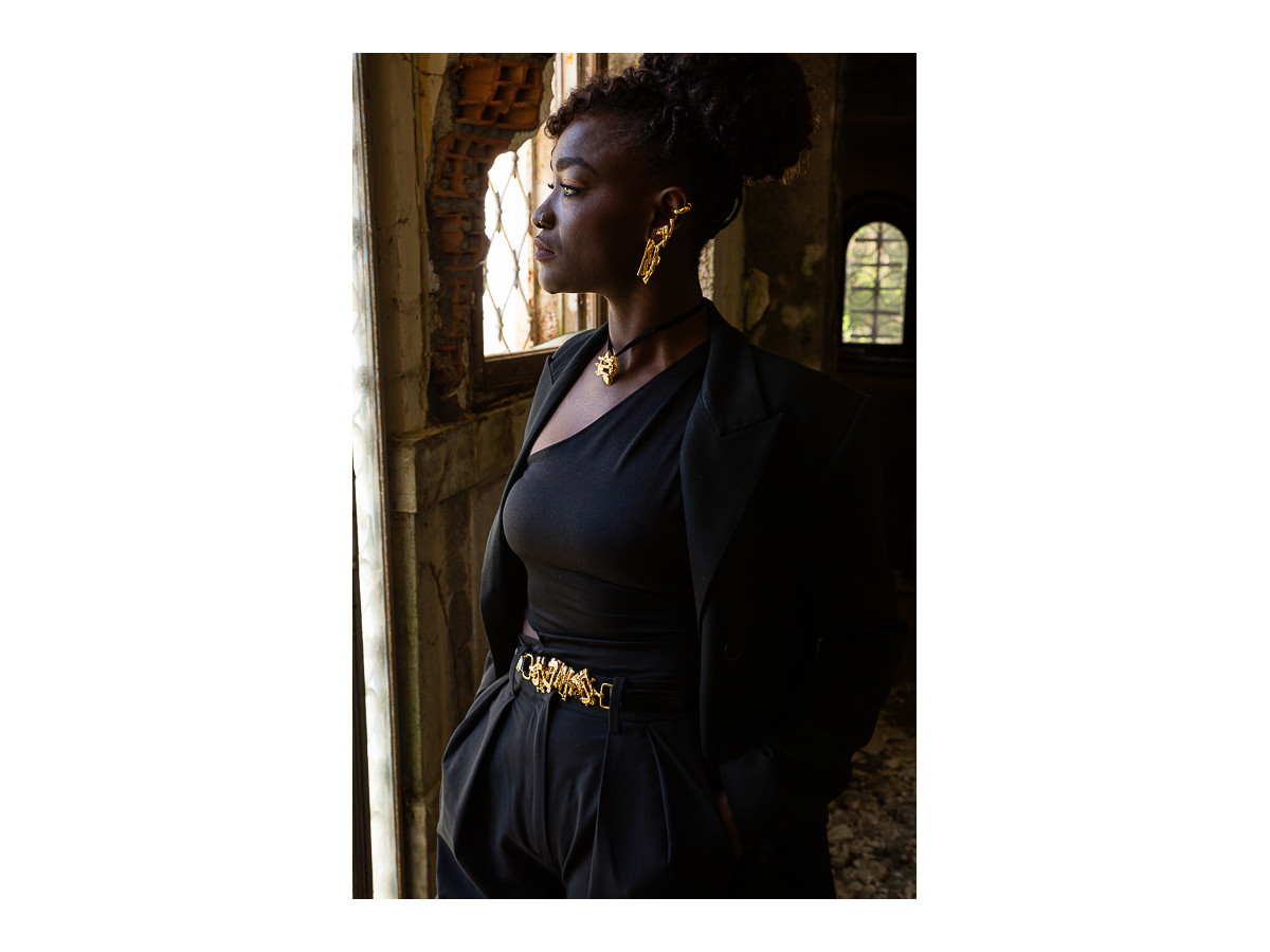 Elégante ceinture bijou, dorée à l'or fin 24 carats, délicatement gravée, aux formes telluriques et dans un esprit couture. Elle est habillée de petites pierres de quartz, embellie d'un message d'amour et de valeurs humaines.